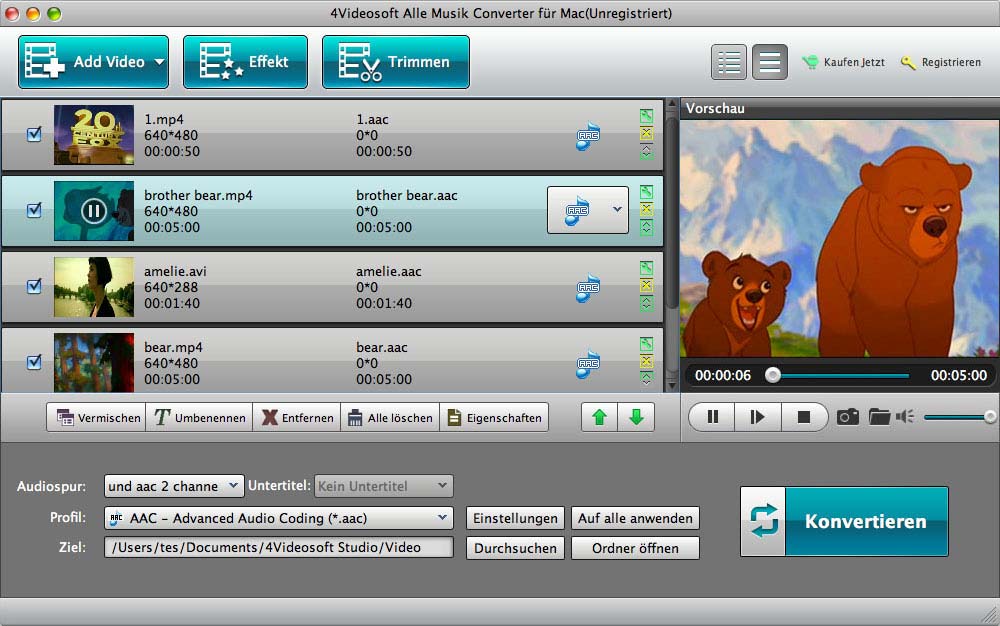 - Mit Hilfe von Alle Musik Converter für Mac können Sie AAC, AMR, MP3, M4A, WAV, WMA-Audio von jeden populären Videoformaten extrahieren.