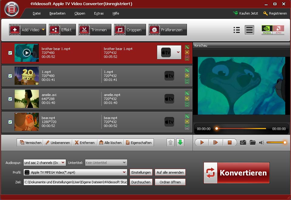 - Sie sind in der Lage, Videos und Audios zu Apple TV kompatiblen MP4, MOV, M4V, FLV, AAC, AIFF, MP3, WAV, u.s.w. umzuwandeln.
