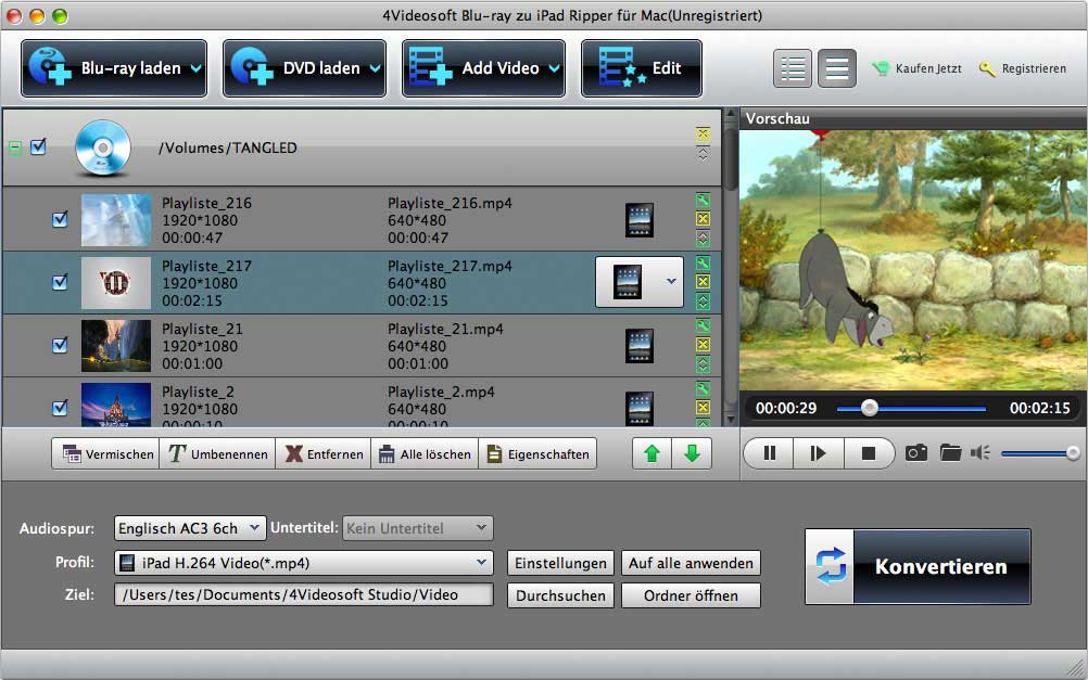 - Blu-ray zu iPad Ripper für Mac ist fähig, hausgemachte Blu-ray Disk zu iPad Video MP4, MOV, M4V und iPad Audio MP3, M4A, AAC auf Mac zu rippen.