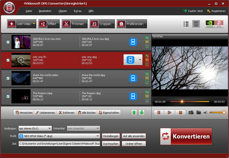Während der Erhaltung von höher Audio- und Videoqualität wandelt DPG Converter beliebiges Video in DPG Datei mit hoher Konvertierungsgeschwindigkeit um.