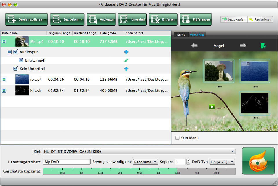 Ab sofort können Sie mit dem DVD Creator für Mac DVD Disc mit gewüschtem Video auf Mac erstellen! Das Mac DVD Brennprogramm kann wie z.B. AVI zu DVD, MPEG zu DVD, MP4 zu DVD, MTS zu DVD, WMV zu DVD, MKV zu DVD usw auf Mac umwandeln und brennen. Außerdem kann dieser Mac DVD Creator auch DVD-Ordner und ISO-Datei erstellen.