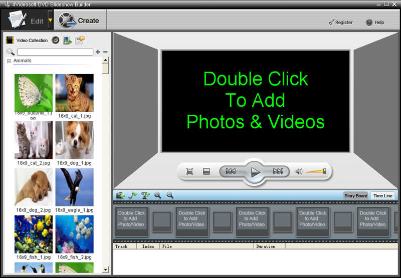 DVD Diashow Erbauer erlaubt Ihnen, direkt hinzufügen von Video, Fotos und Hintergrundmusik aus der lokalen Diskette oder aus dem Build-in Video/Audio –Sammlungen