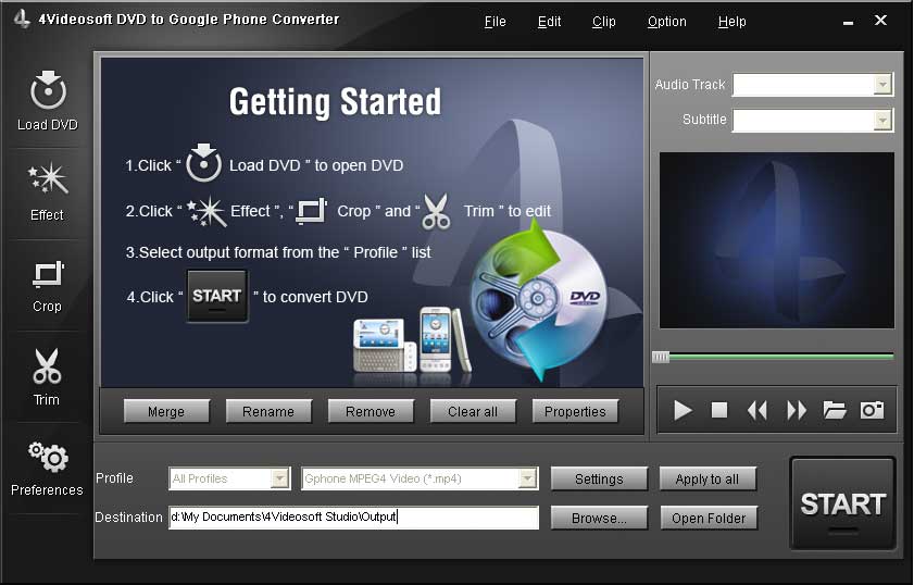 Nach Ihrer Bevorzugung enthält DVD zu Google Phone Converter einige andere Bearbeitungsfunktion. Sie können Untertitel und Audiospuren wählen, Snapshotaufnahme von Ihrem Lieblingsbild, setzen die Ausgangsvideo-Größe, Ernte der DVD-Film abzuspielen Region, um mit Google Phone anzupassen, croppen DVD Film Abspielsregion, Ihr Google Phone zu ,stellen die Video-Effekte, hinzufügen Wasserzeichen , fügen mehrere Dateien in eine, usw.