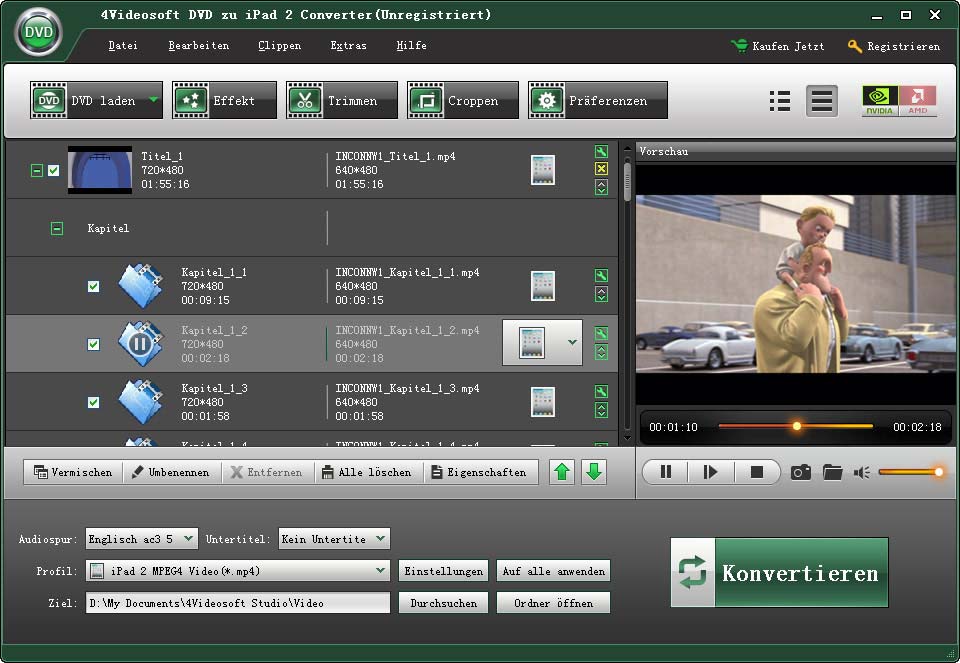 - DVD zu iPad 2 Converter ist wirklich mit schnellster Konvertierungsgeschwindigkeit einfach zu benützen.