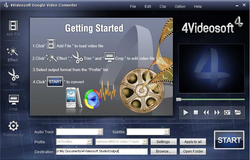 Google Video Converter kann alle regulären Formate in H.264/MPEG-4(.mp4), MP4, 3GP, WMV Video und MP3, AAC, AMR, M4A, WAV, WMA Audio für das smarte Telefon.