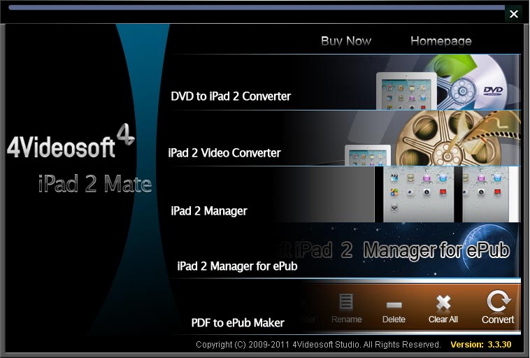 iPad 2 Mate, multifunctionelles iPad 2 Software Paket, besteht aus fünf wundervollen Converter Tools – DVD zu iPad 2 Converter, iPad 2 Video Converter, iPad 2 Manager, iPad 2 Manager für ePub und PDF zu ePub Maker.