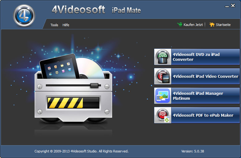 iPad Mate enthält DVD zu iPad Converter, iPad Video Converter, iPad Manager Platinum und PDF to ePub Maker, bietet iPad-Benutzern die perfekte Lösung, um DVDs/Videos auf iPad zu konvertieren, iPad-Dateien zu verwalten und PDF in ePub-Format umzuwandeln. Damit können Sie DVDs, Videos, ePubs ohne Grenzen auf iPad genießen.