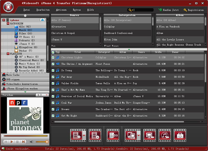 iPhone 4 Transfer ist eine intelligente iPhone 4 Transfer Software für Sie und kann Musik, Film, Photos, Kamera Roll, Klingelton, Kamera Shot Dateien von iPhone 4 zu Computer und umgekehrt von Computer zu iPhone 4 übertragen. Der iPhone 4 Transfer Platinum ermöglicht es Ihnen, TV Shows, Podcast, iTunes U, Voice Memos, eBooks, SMS und Kontakte zu übertragen.