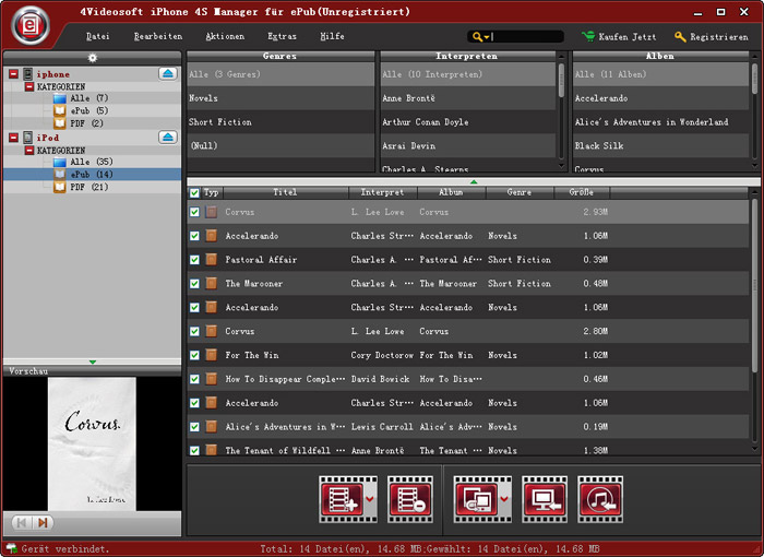 Dieser iPhone 4S Manager für ePub hilft Ihnen, ePub Datei nach der Kategorie von Genre, Album und Interpreten auszusieben. Außerdem unterstützt dieser iPhone 4S Manager für ePub iPhone 6s, iPhone 6s Plus, iPhone 6, iPhone 6 Plus, iPhone 5s/5c, iPhone 5, iPhone 4S, iPhone 4, iPad Pro, iPad Air 2, iPad mini 4/3/2, iPad mini, das neue iPad, iPad 2, iPad, iPod, usw.