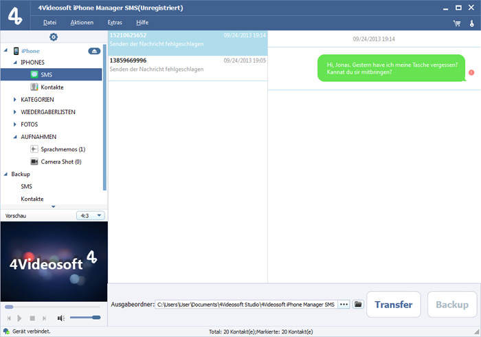 - Mit Hilfe von diesem Manager kann ich alle meiner wichtigen SMS zu meinem Computer zum Backup kopieren, damit Ich den Dateienverlust vermeiden kann.