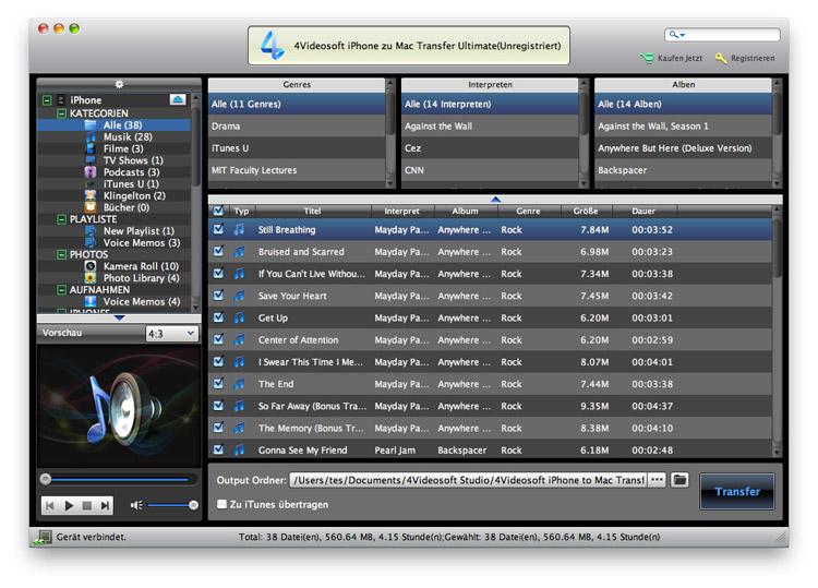 iPhone zu Mac Transfer kann iPhone Video, Audio, Photo, Klingelton, Kamera Roll und Kamera Shot direkt zu Mac übertragen. Die iPhone zu Mac Transfer Ultimate Software kann auch TV Shows, Podcast, iTunes U, ePub, PDF, Audiobücher, Voicememos, SMS und Kontakte von iPhone zu Mac übertragen.