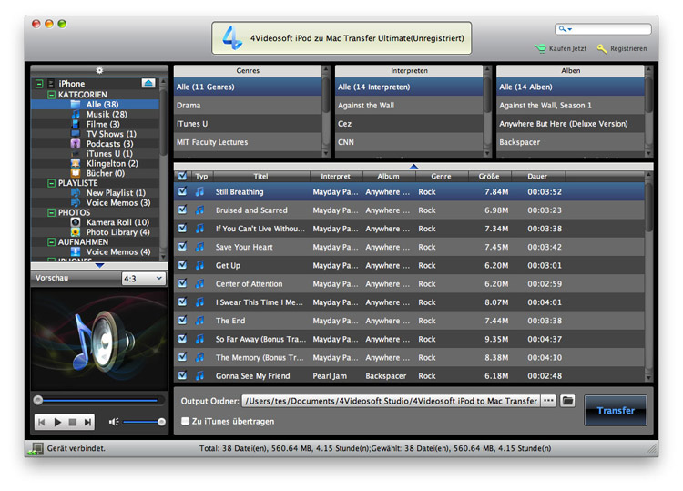 iPod zu Mac Transfer ist eine professionelleiPad Transfer Software, die die vonn Ihnen ausgewählten Video, Audio und Bild Dateien zu Ihrem Mac ohne Datenverlust übertragen kann. Mit diesem iPad zu Mac Transfer Ultimate können Sie Musik, Fime, TV Shows, Podcast, iTunes U, ePub, PDF, Audiobücher, Kamera Roll, Bilder, Voice Memos, Kamera Shot von iPad zu Mac übertragen.