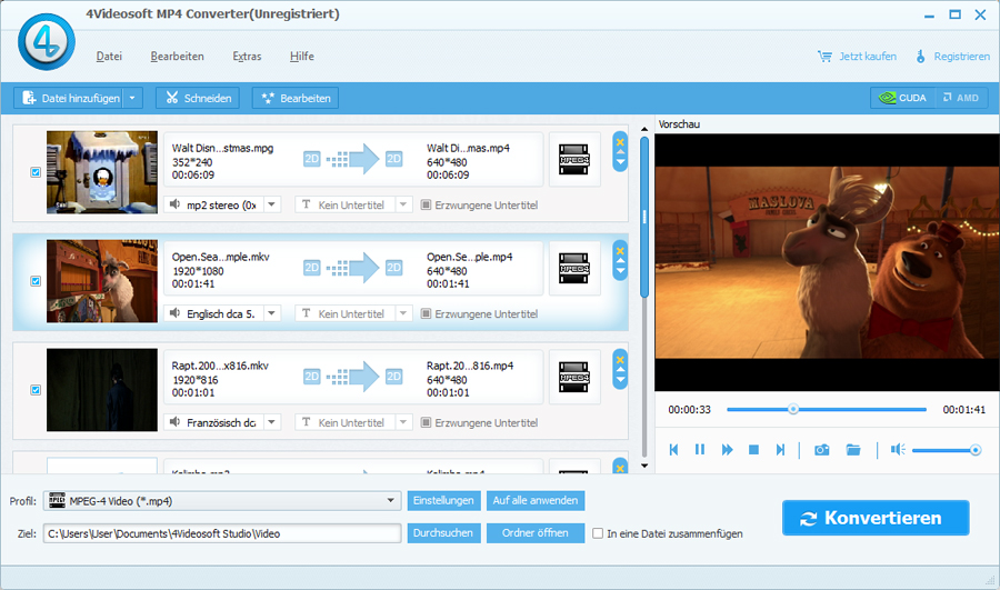 - MP4-Datei in gängige 2D(AVI/MOV/WMV usw.) oder 3D Videos beliebig konvertieren