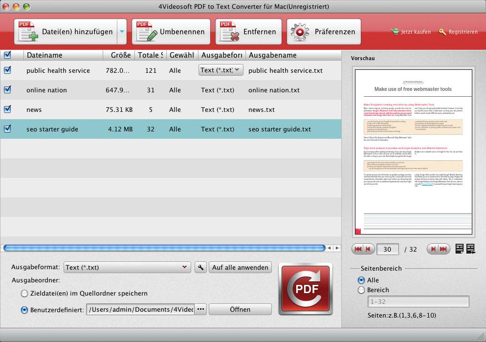 - Dieser Mac PDF to Text Converter ermöglicht es Nutzern, die zu konvertierenden PDF-Seite(n) frei zu definieren. Sie können alle PDF-Seiten oder nur eine einzelne Seite umwandeln.