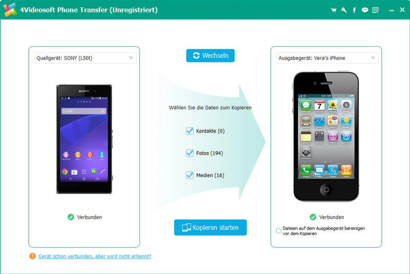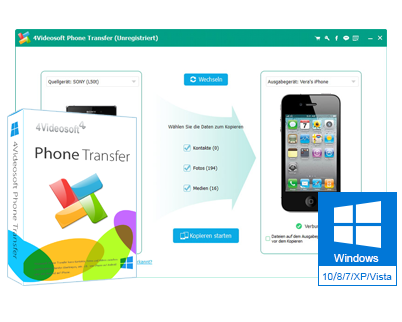 Phone Transfer ist eine professionelle Handy Transfer Software. Es ermöglicht Ihnen, Kontakte, Fotos und Videos mit nur wenigen Klicks zu übertragen. Der Handy Transfer kann Kontakte, Fotos und Videos zwischen zwei verschiedenen Telefonen übertragen, wie z. B. von iPhone auf Android-Handy oder vom Android-Handy zu iPhone. Darüber hinaus können Sie Dateien von Ihrem zertrümmerten Telefon oder alten Handy auf ein neues Handy übertragen. Jetzt unterstützt Phone Transfer iPhone 6s/6s Plus/6/6 Plus, iPad Pro, Samsung Galaxy S5/Note 4, usw.