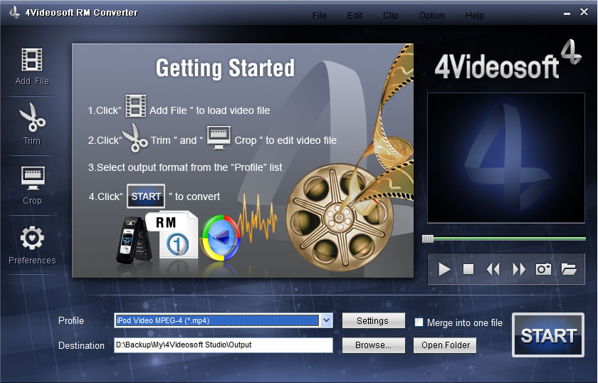 RM Converter hat die hohe und effiziente Umwandlungsgeschwindigkeit, denn er verfügt über mehr zusätzliche Bearbeitungsfunktionen: Video schneiden, Video beschneiden, Video verschmelzen und Momentaufnahme machen. Mehr spezifischen Parameter von Einstellungen sind Ihnen verfügbar, die perfekten visuellen Effekte zu erhalten. Sie können die unvermuteten Ergebnisse nur wenige Klicken bekommen.