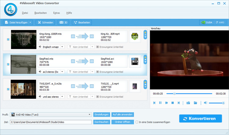 MP4 Nebeneinander 3D, MP4 Oben-und-Unten 3D, MP4 Anaglyph 3D, MKV Nebeneinander 3D, MKV Oben-und-Unten 3D, MKV Anaglyph 3D, TS Nebeneinander 3D, TS Oben-und-Unten 3D, TS Anaglyph 3D, AVI Nebeneinander 3D, AVI Oben-und-Unten 3D, AVI Anaglyph 3D, FLV Nebeneinander 3D, FLV Oben-und-Unten 3D, FLV Anaglyph 3D |