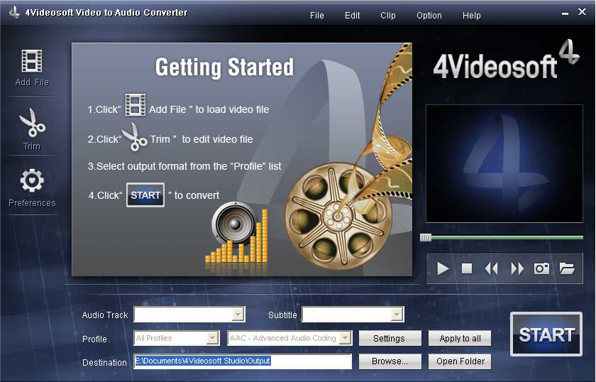 Die starke Bearbeitungsfunktionen von Video zu Audio Converter bildet die Umwandlung klarer. Die spezifischen Parameter für umgewandelten Audio bilden den Audio am passendsten für Palyer. Es kann alle mögliche Zeitlänge Clips von der Quelldatei gefangennehmen, erlaubt es Ihnen, Audiospur und Untertitel zu wählen oder die getrennten Dateien in eine Datei verbinden.